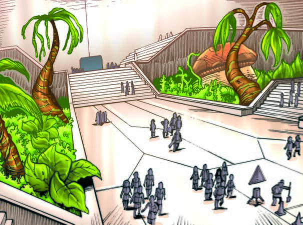 La ville est scindée en deux zones distinctes : au Nord, les futurs quartiers destinés aux civils, et au Sud, une base militaire réservée à l’armée. Les installations sont séparées traversant de grandes pelouses verdoyantes parsemées de buissons multicolores aux fleurs exotiques[13].