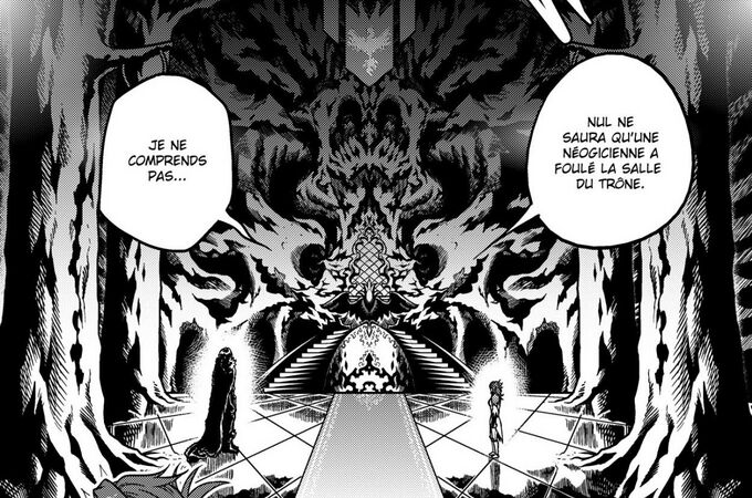 | + | ** Il est notamment le siège du pouvoir, et on y trouve la salle ou trône le chef de la Coalition. On y accède par un couloir luxueux aboutissant sur une porte immense, taillée dans un minerai écarlate au revêtement translucide, similaire à un rubis. Plusieurs gravures représentant les huit aspects de la [[Vie]] et de la [[Mort]] se rejoignent en son centre pour représenter Glacesang. Lorsqu’on pousse sur ce point central, la structure s’illumine et s’ouvre dans un grondement sourd sur une pièce aux parois brutes, directement taillées dans la roche noire parcourue de veines écarlates. En son centre, se dresse un trône vers le quel convergent les nervures de la pierre<ref>{{Roman Néogicia|livre=2|page=81 à 83|noarticle=}}</ref>. Elle aboutit, après de larges escaliers, au reste de la ville | ||